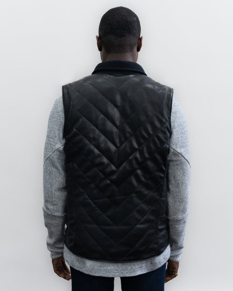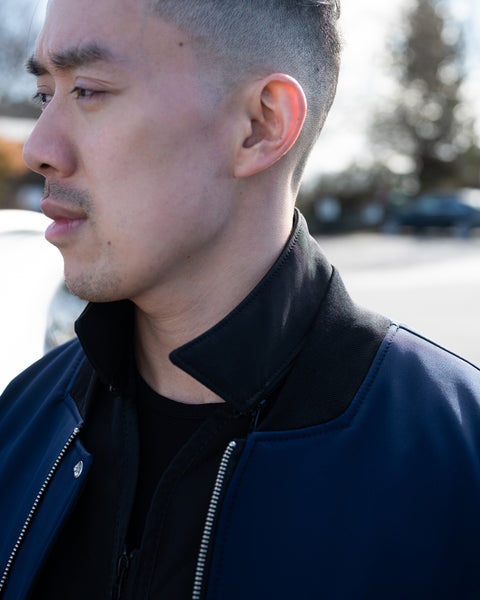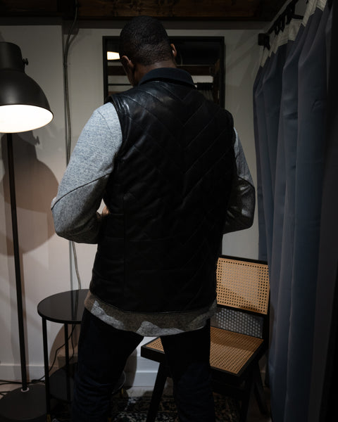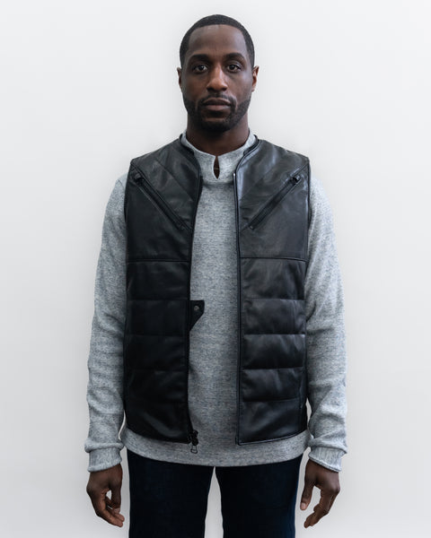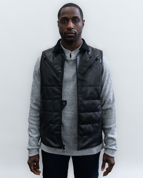 Lambskin leather, chunky rib knit collar, cuff and hem, with custom lining.