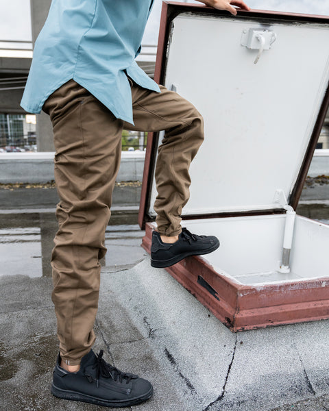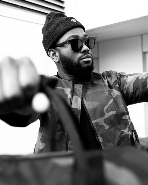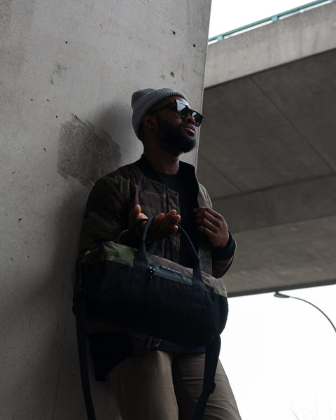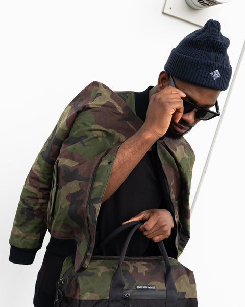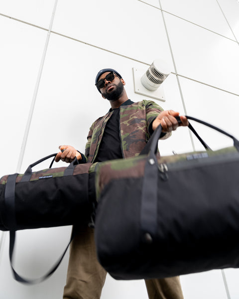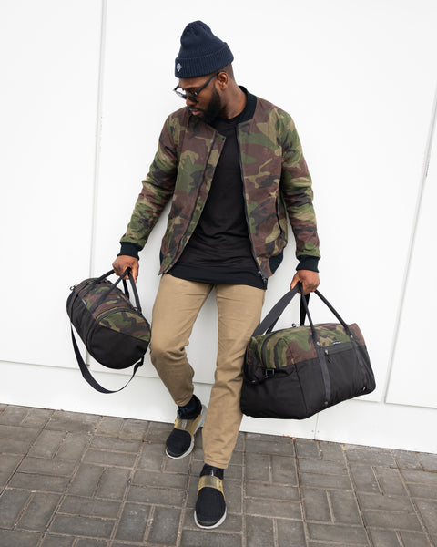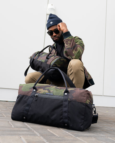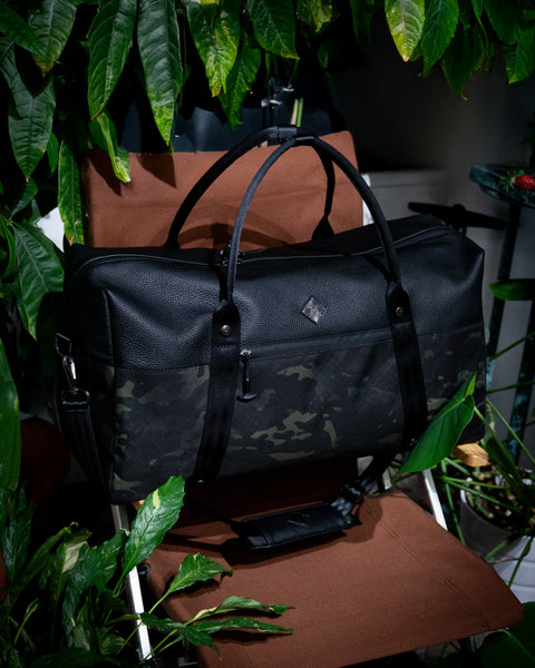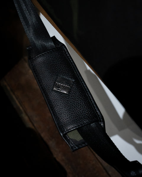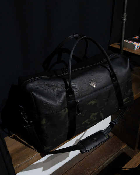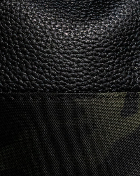 DWR coated frogskin camo nylon reverse-side. Dual side pockets on leather and nylon.
